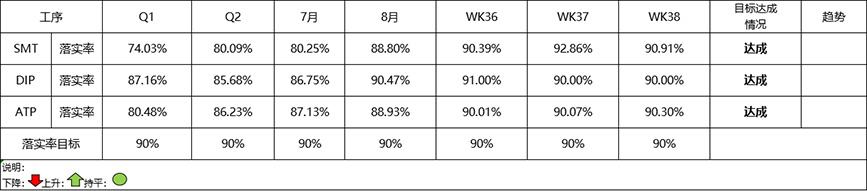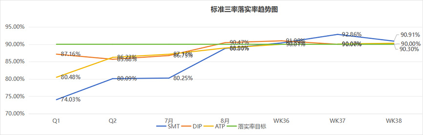 在標準三率落實率趨勢圖中,我們欣喜地看到,SMT/DIP/ATP終端團隊以高度的責任感和使命感,認真執(zhí)行三率標準,積極地整改存在的問題,落實率在逐月提高,目前已全部達成目標值。這些成績的取得,離不開每一位員工和領(lǐng)導(dǎo)層的辛勤付出和不懈努力。10月期望各車間向95%大關(guān)邁進!
