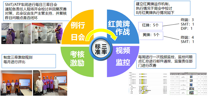 終端車間不僅有每日三率專員的二級稽查、還建立了各種維度的專項稽查如近期的文件排雷、紅黃牌作戰(zhàn)、視頻監(jiān)控等,并舉行三率例行日會和周會檢討發(fā)生的問題點并進行整改。同步制定了三率激勵機制,以保證員工落實標準三率的積極性,保證工廠標準三率有效改善!