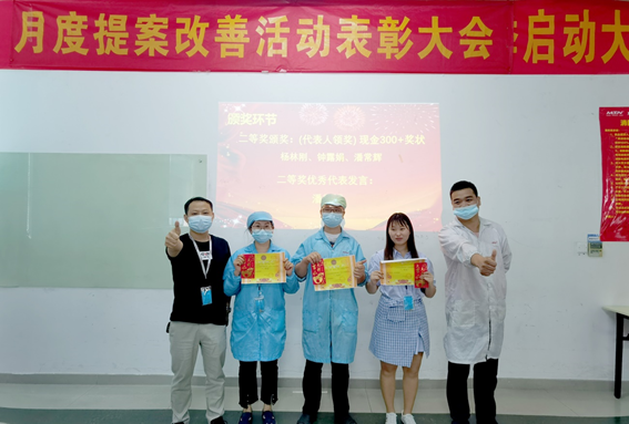 2月份,共收到員工提出141項提案,經(jīng)各評審小組審核評選,最終角逐出一等獎1名,二等獎3名,三等獎6名,評審小組成員分別為優(yōu)秀提案改善項目人員頒發(fā)榮譽證書、獎金,并合影留念。