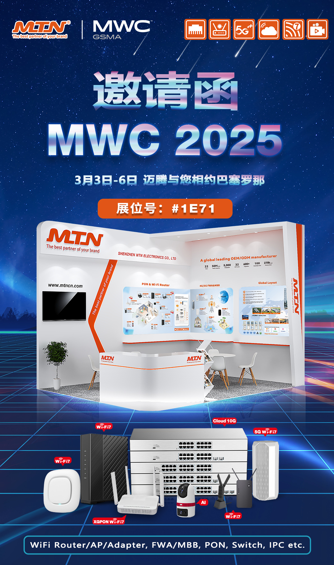 2025年世界移動通信大會(25MWC)盛大啟幕在即,這是一場全球矚目的通信行業盛會,邁騰電子攜Wi-Fi 7 Router、4G/5G FWA&MBB、AI-IPC等一系列產品和技術亮相。在此,我們誠摯地邀請您蒞臨我們的展位,一同探索通信科技的無限可能!