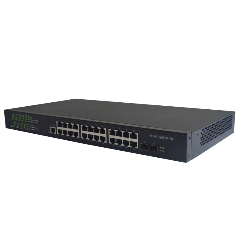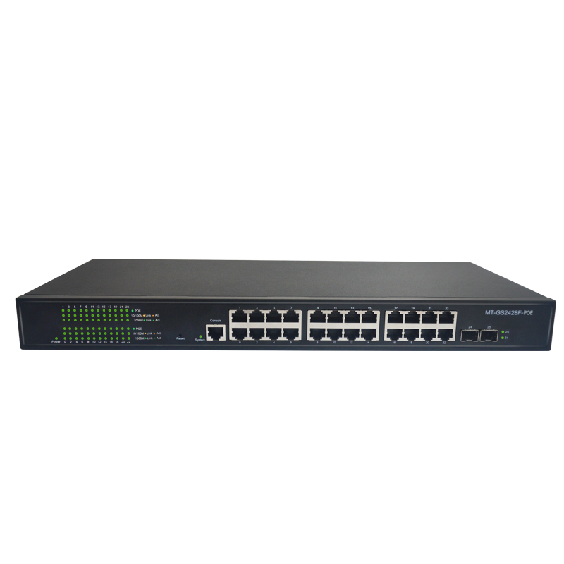 24 10/100/1000M RJ-45 MDI/MDI-X port(Including 8 POE port), 2 gigabit SFP port 1 Console RJ45 |