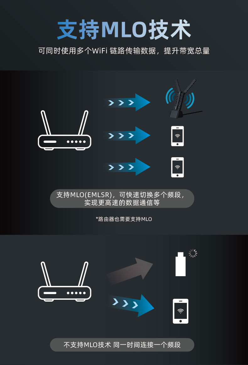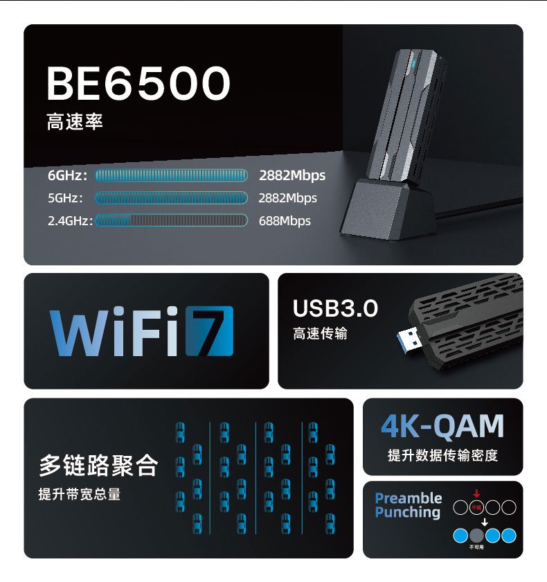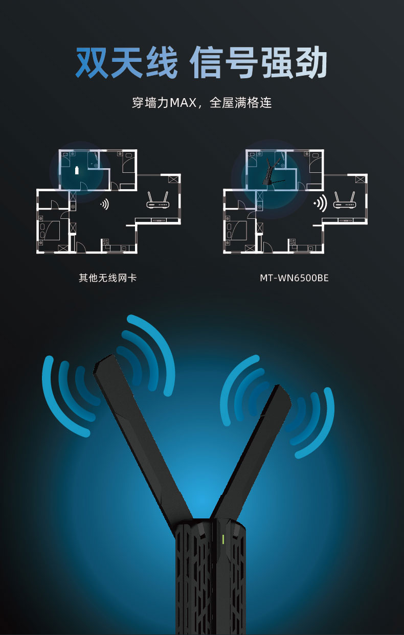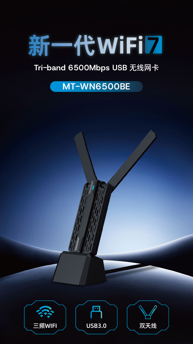 MT-WN6500BE是一款支持802.11BE協議的三頻WiFi7 USB無線適配器